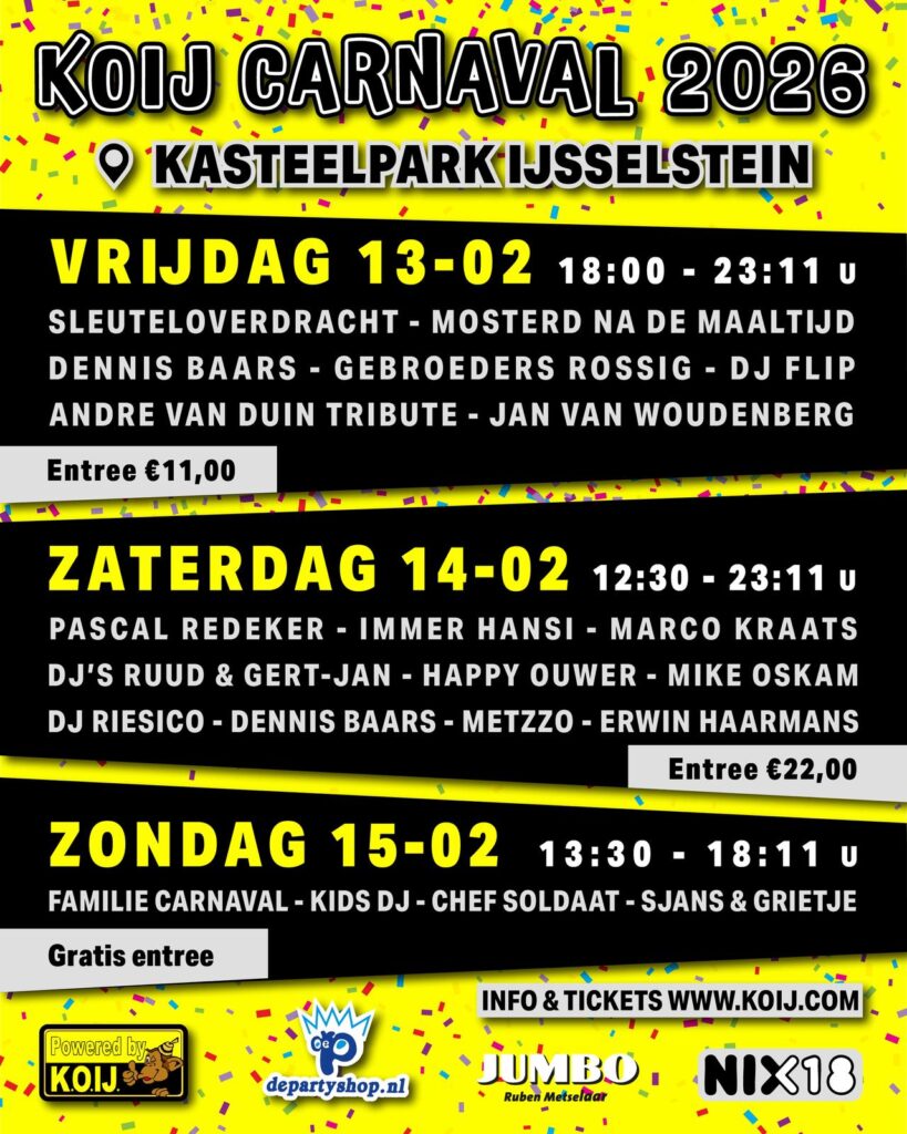 Tickets hiervoor zijn verkrijgbaar voor €11,- (excl. servicekosten) via deze link: KOIJ Carnaval 2026